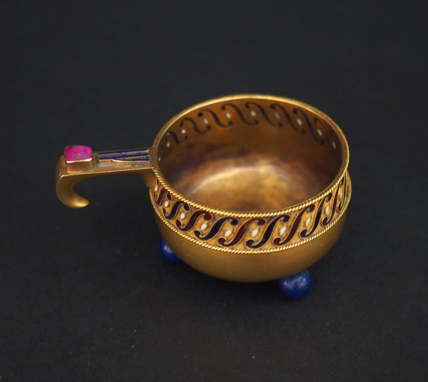 Alexandre Edvard TILLANDER (1837 - 1918) Tcharka - kovsh tripode en or et émail. Saint-Pétersbourg, fin du XIXe siècle. Le corps cylindrique à base arrondie est surmonté d'une large ceinture décorée en émail plique-à-jour de esses alternés bleu et rouge, séparés par des amandes en émail blanc (les trois couleurs de la Russie), ceinture à bords soulignés d'une fine cordelette. La prise traditionnelle de kovsh est ornée d'un cabochon de rubis ou quartz rose de taille irrégulière serti clos et porte les initiales "ЛИ" (L I) en émail cloisonné bleu. Cette tcharka repose sur trois pieds boule en lapis-lazuli. Or (583/1000), émail et pierre dure. Poinçons : 56, Saint-Pétersbourg et orfèvre "A T" ( Alexandre Edvard Tillander). Hauteur : 3 cm , Diamètre : 3,8 cm , Poids brut : 26,15 g Dans un écrin à la forme en cuir, intérieur velours et satin. Marquage de la firme "К. ГАНЪ" (Karl-August Hahn à Saint-Pétersbourg) Dimensions de l'écrin : 8,3 x 6,5 x 3,5 cm Expert : Nicolas Filatoff