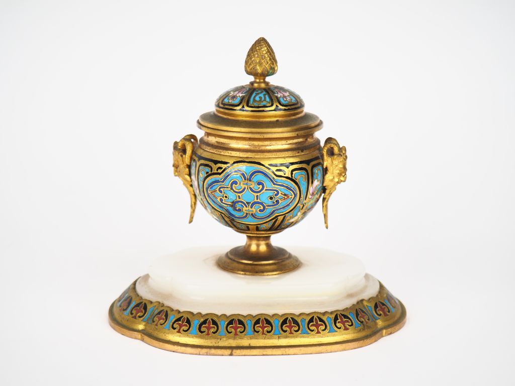 Barbedienne (attribué à) Encrier Napoléon III en bronze doré et émaux cloisonnés, base en albâtre. H. 13 cm
