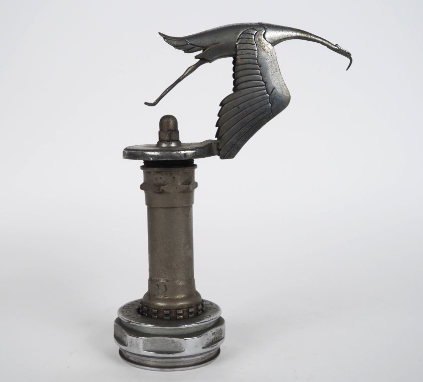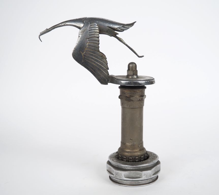 BAZIN. Hispano Suiza. Bouchon de radiateur en métal chromé. H. 30 cm (bec de l'oiseau tordu,le bout des ailes est coupé).