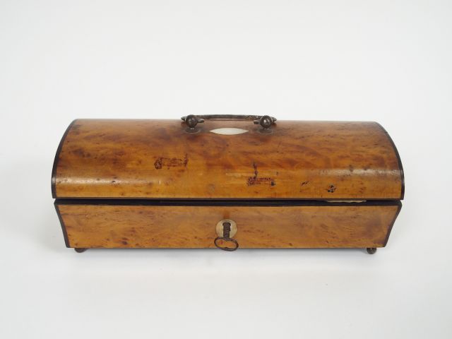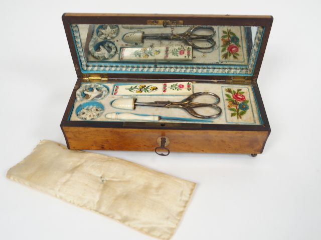 Lot de Boite à couture Restauration en loupe d'orme et nacre, avec ses access au prix de 200 à 300 € en vente aux enchères par l'hôtel des ventes Primardeco