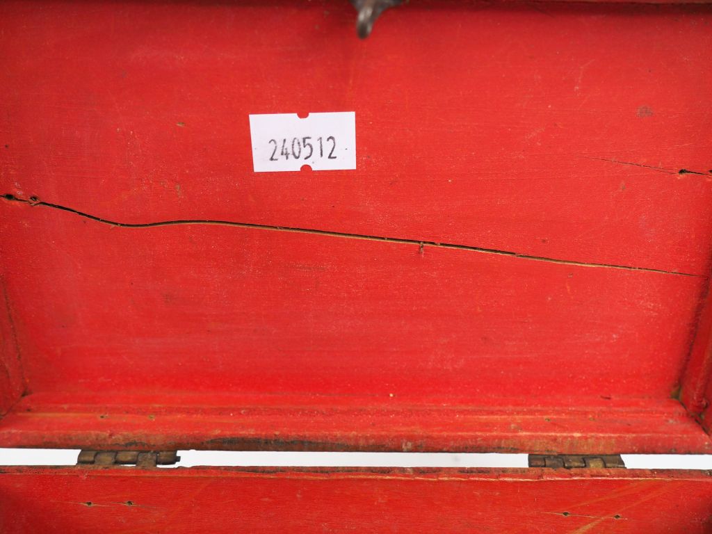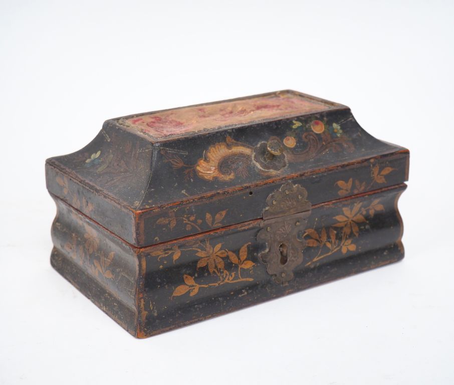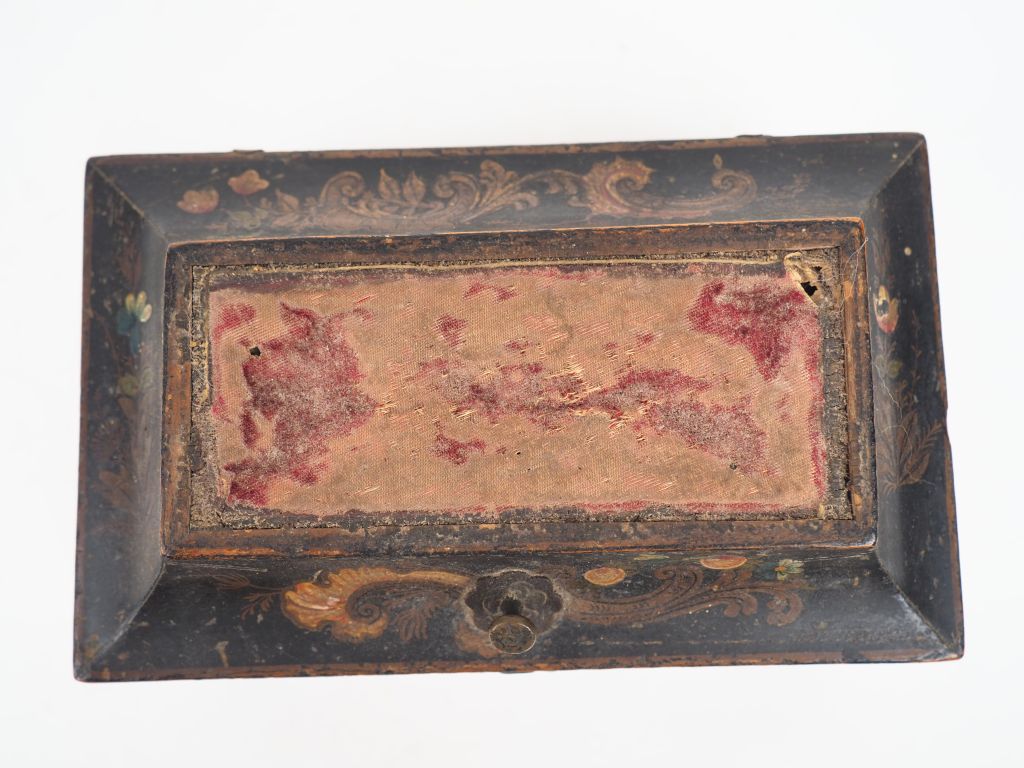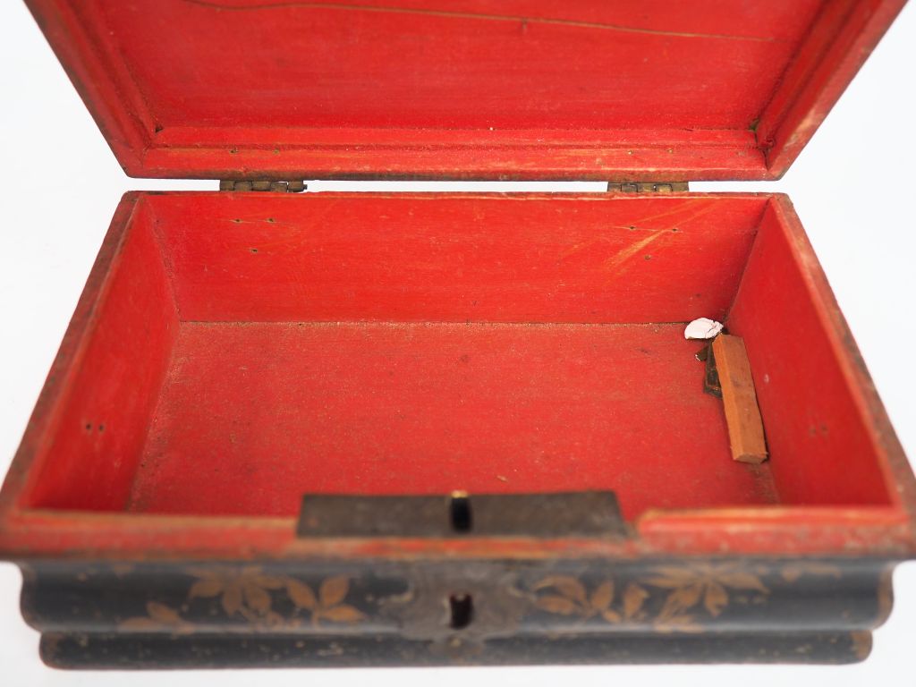 Boite à couture XIXème en bois laqué noir et doré à décor de rocailles et de fleurs. Dim. 10 x 17,5 x 10,5 cm (couvercle du haut fendu à l'intérieur)