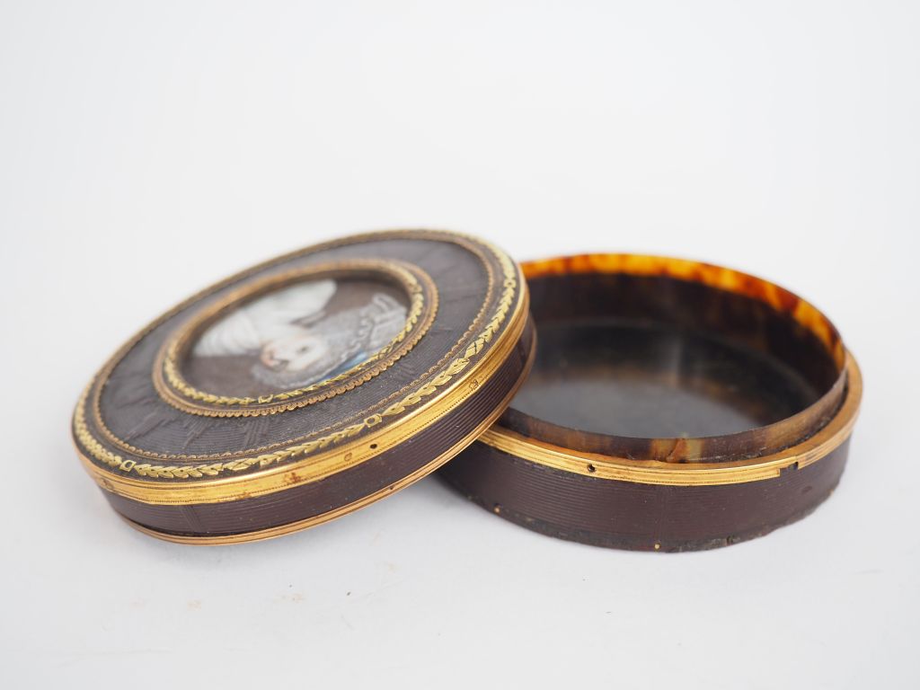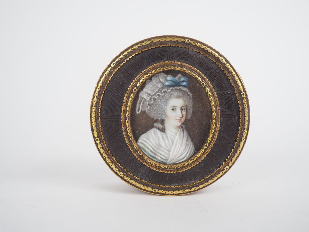 Boîte à fard fin XVIIIème - début XIXème en bois, écaille et pomponne ornée en son centre d'une miniature, "portrait de dame au nœud de ruban bleu". Dim. 2,5 x 7,5 cm. (petits chocs sur la base)
