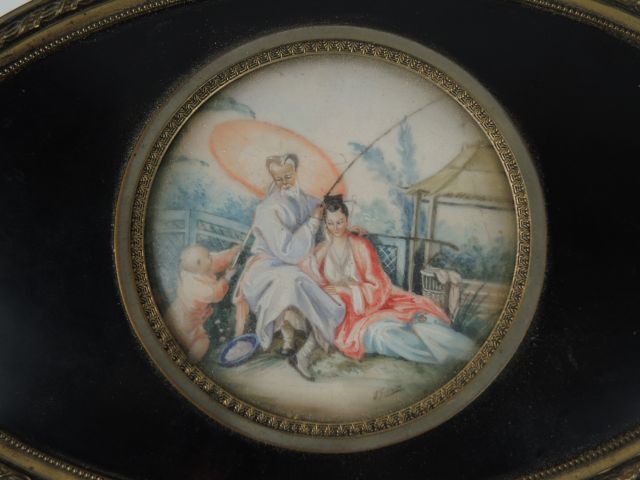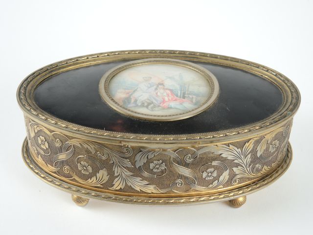 Boite à musique de style Louis XVI en métal gravé, le couvercle orné d’une miniature figurant une scène galante Extrême orientale