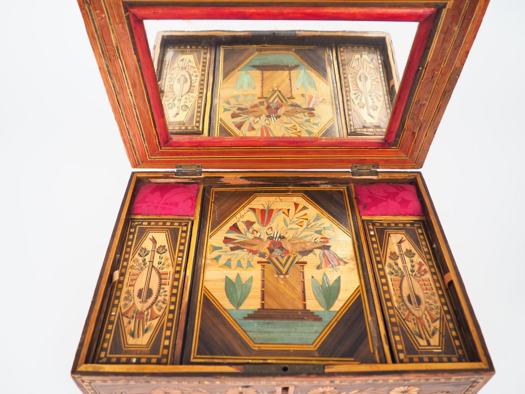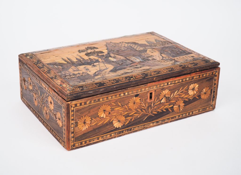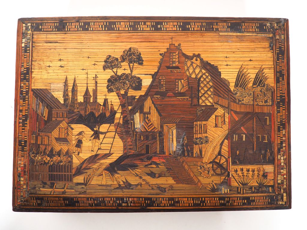 Boîte à ouvrage début XIXème en marqueterie de paille, couvercle à décor de village animé, intérieur à décor de fleurs et de cythares. Dim. 10 x 30,5 x 21,5 cm. (Petits accidents et restaurations)