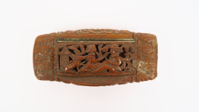 Boite à priser fin XVIIIème début XIXème en corozo sculpté, à décor de trophée militaire et de personnage