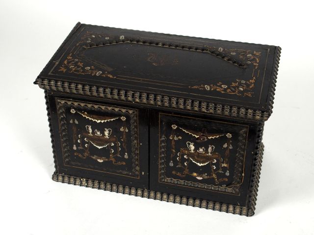 Boîte à thé Napoléon III en bois noirci à décor marqueté de laiton et d'ivoire à décor de tables dresssées sous des lambrequins, et de fleurs. Contenant trois flacons en porcelaine. (accidents au coffret). 15 x 24,5 x 14 cm