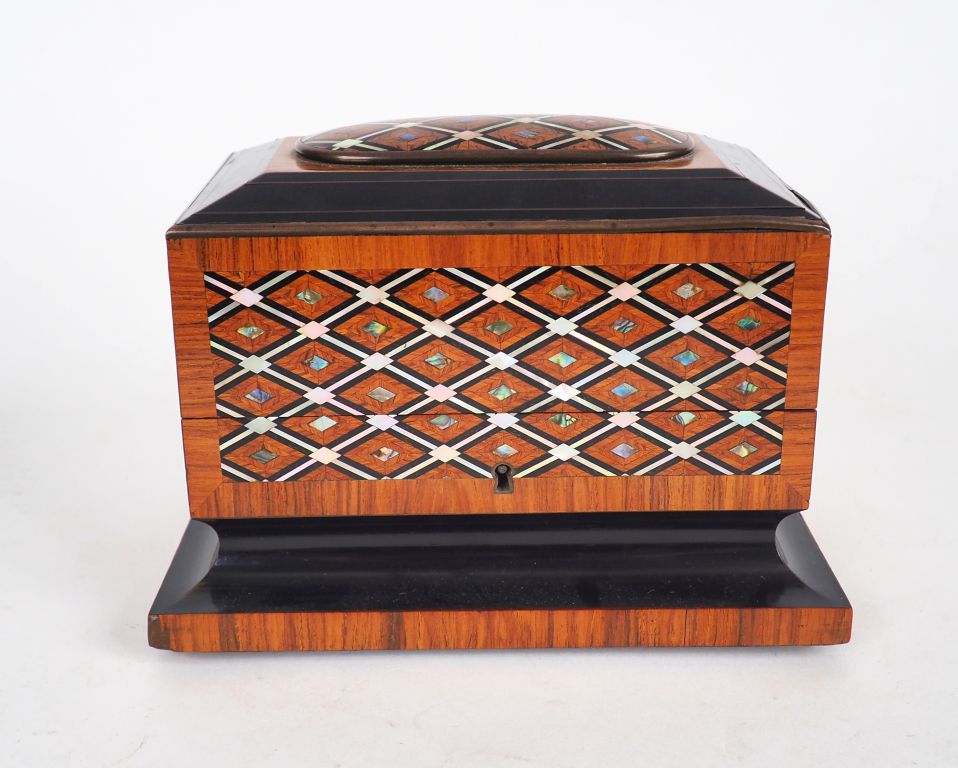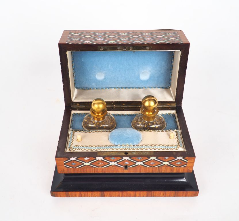 Boite de toilette musicale en marqueterie de bois précieux et de nacre, décor de croisillons à l'intérieur, deux flacons en cristal (égrenure) et un réceptacle couvert de soie et de velours. Signée Sogny à Marseille Dim. 14 x 19,5 x 12,5 cm