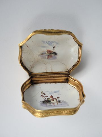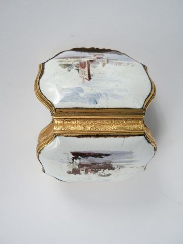Boîte en émail fin XVIIIe-début XIXe à décor polychrome de paysage lacustre, monture en pomponne de style Louis XV (petits cheveux)