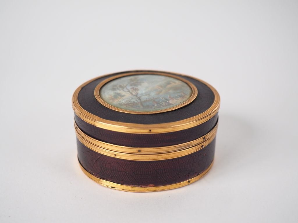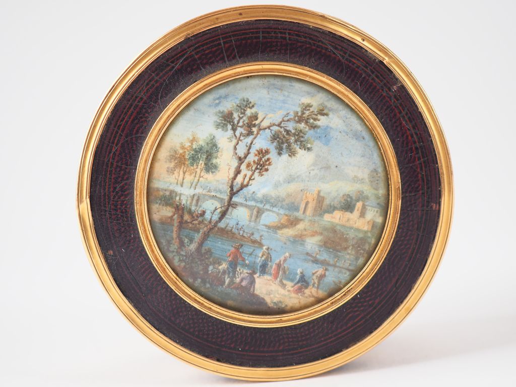 Boite fin XVIIIème en cuir, monture en pomponne, le couvercle orné d'une fine miniature à décor de paysage lacustre animé. Diam. 6,5 cm