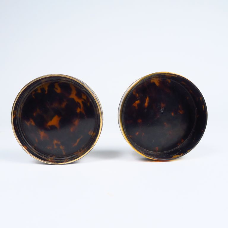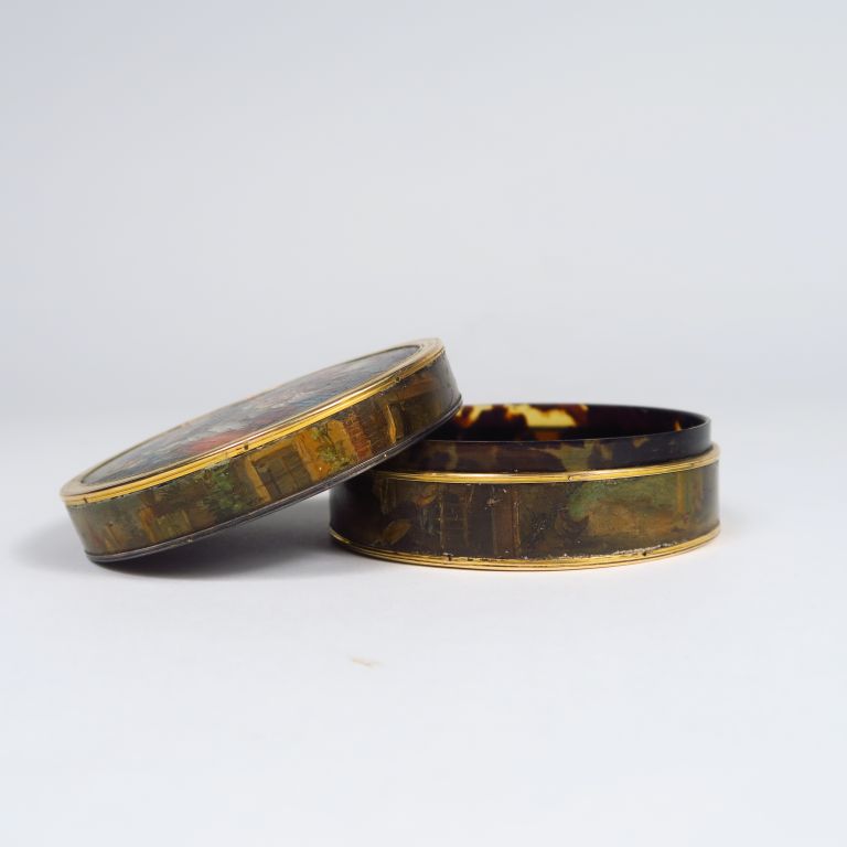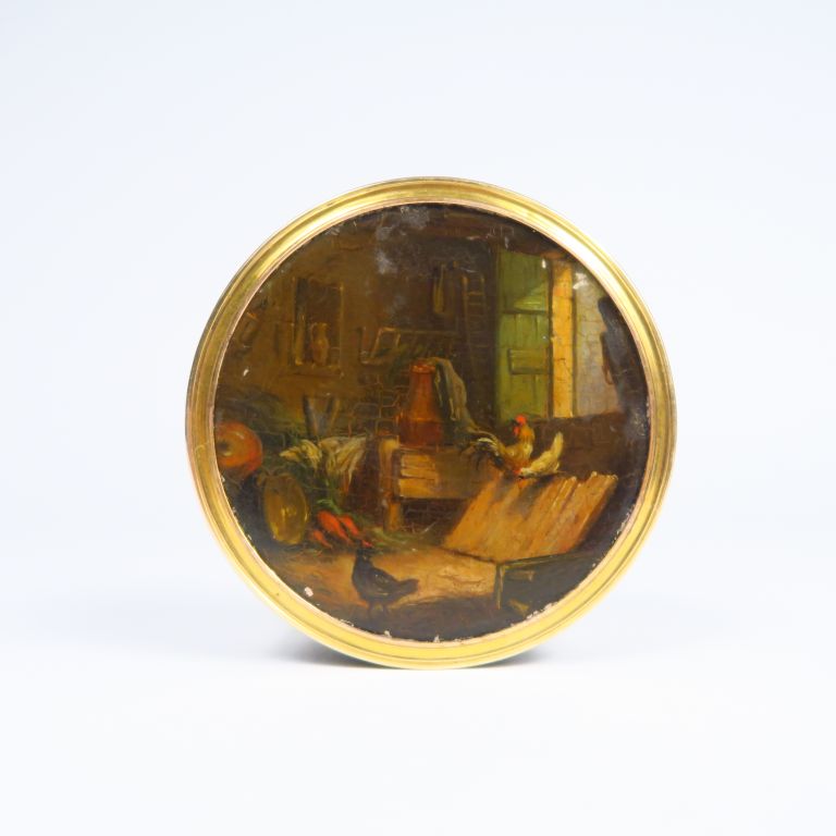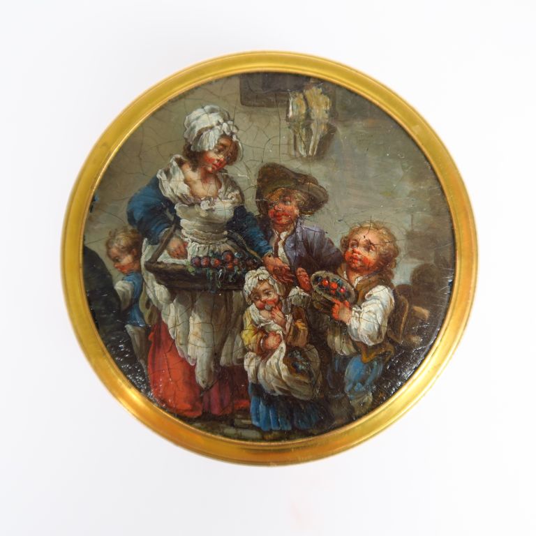 Boite peinte fin XVIIIème à décor en plein, d'enfants et de scène de la vie quotidienne à la ferme, monture en or ou pomponne, intérieur en écaille. Diam. : 8,2 cm. (petite restaurations)