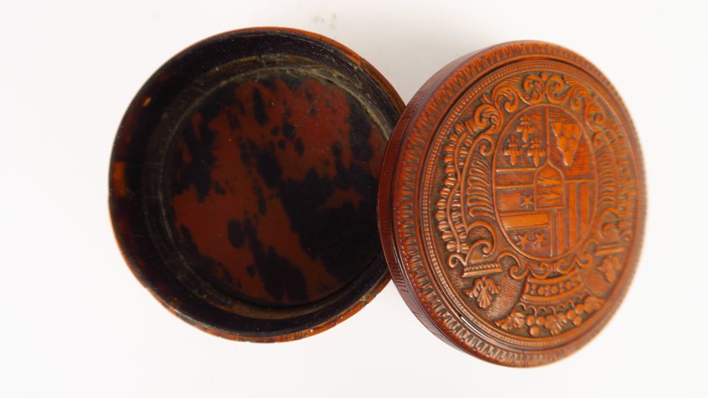 Boite ronde XIXe en buis sculpté, couvercle à décor d'armoiries. Diam. : 8,5 cm. (Petits accidents)