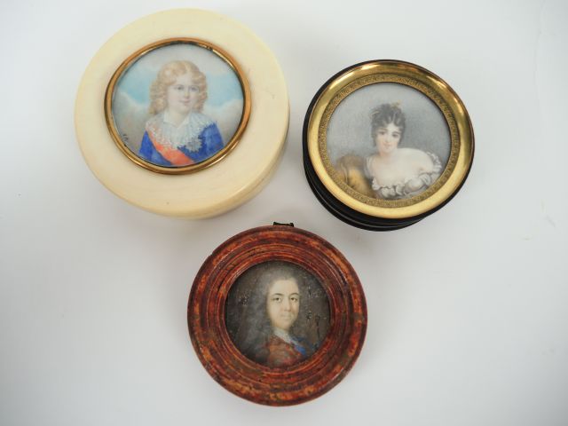 Boite XIXème en ivoire et écaille, le couvercle orné d’une miniature figurant le portrait du roi de Rome, monogrammée VR . Diam. : 8 cm. On y joint une boite 1900 en ébène, le couvercle orné d’un portrait de Mme de Récamier et une miniature XIXème ‘Portrait d'homme'