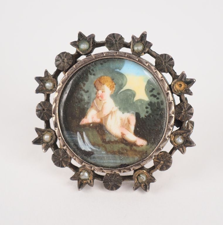 Broche ancienne en métal argenté et perles contenant une miniature, "chérubin près d'une source". Diam. 3 cm.