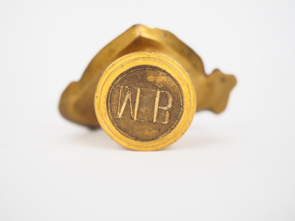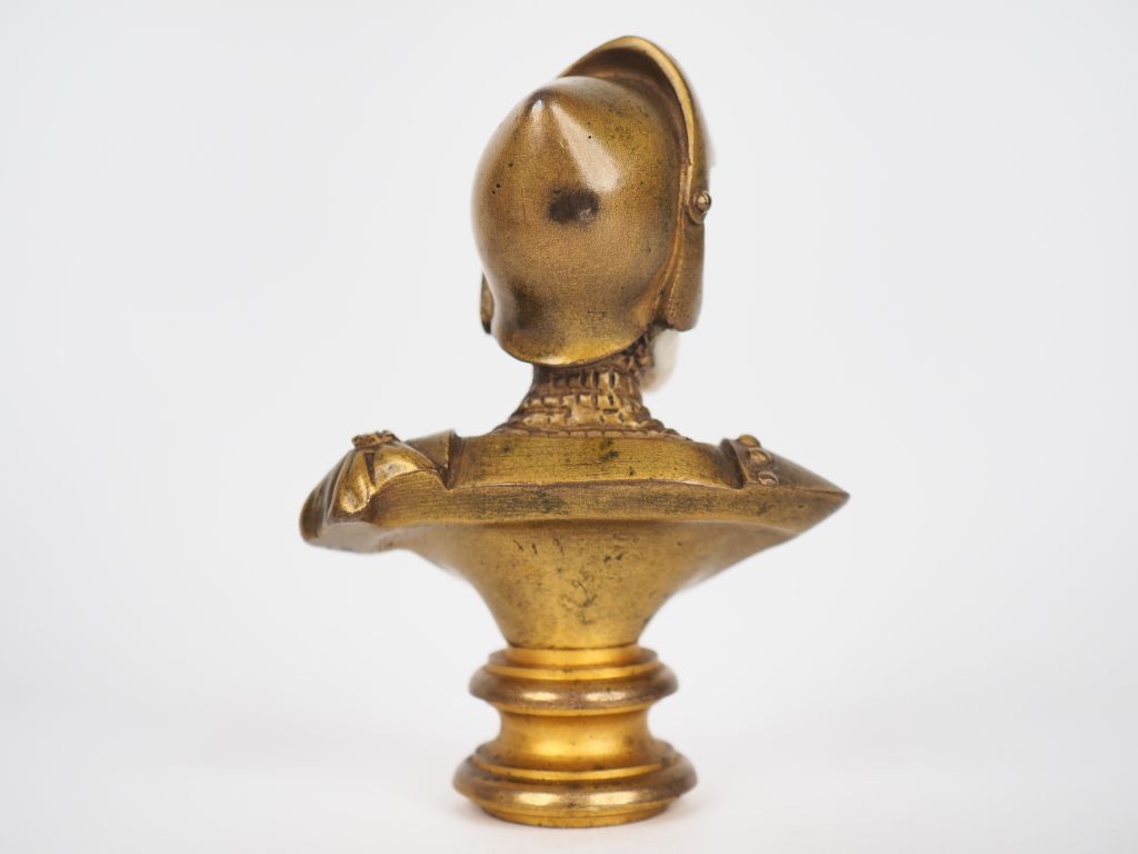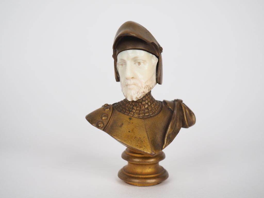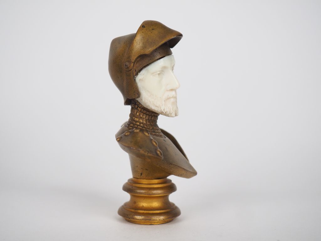 Cachet Napoléon III fin XIXème en bronze et ivoire figurant un buste d'homme en armure. Dans son coffret gainé de cuir. H. 7,5 cm. Poids. 199 g. Certificat CITES en cours.