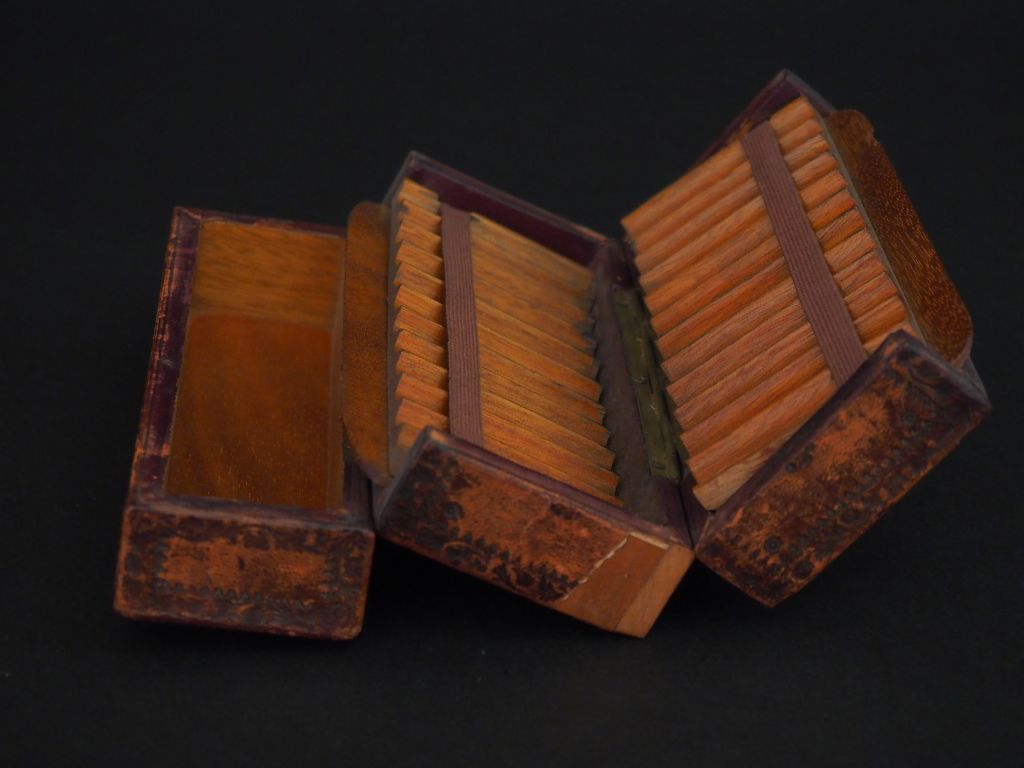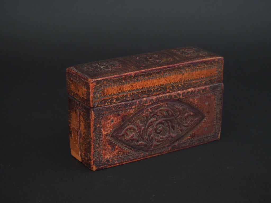 Cave à cigares en bois gainé de cuir gaufré, à décor de fleurs et de masques de lions. Dim. 8,5 x 14,5 x 5 cm. (usures)
