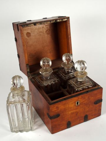 Cave à liqueur XIXème en acajou et laiton comprenant : quatre flacons en cristal à décor de godrons. Dimensions du coffret : 23 x 20 x 20 cm (petits sauts de placage, cristallerie intacte)