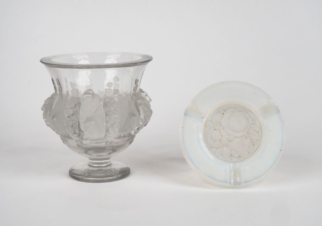 Cendrier Art Déco en verre en partie opalescent à décor de fleurs. Diam.10,5 cm LALIQUE. Vase Médicis à décor de frise de moineaux. H. 12 cm Signé