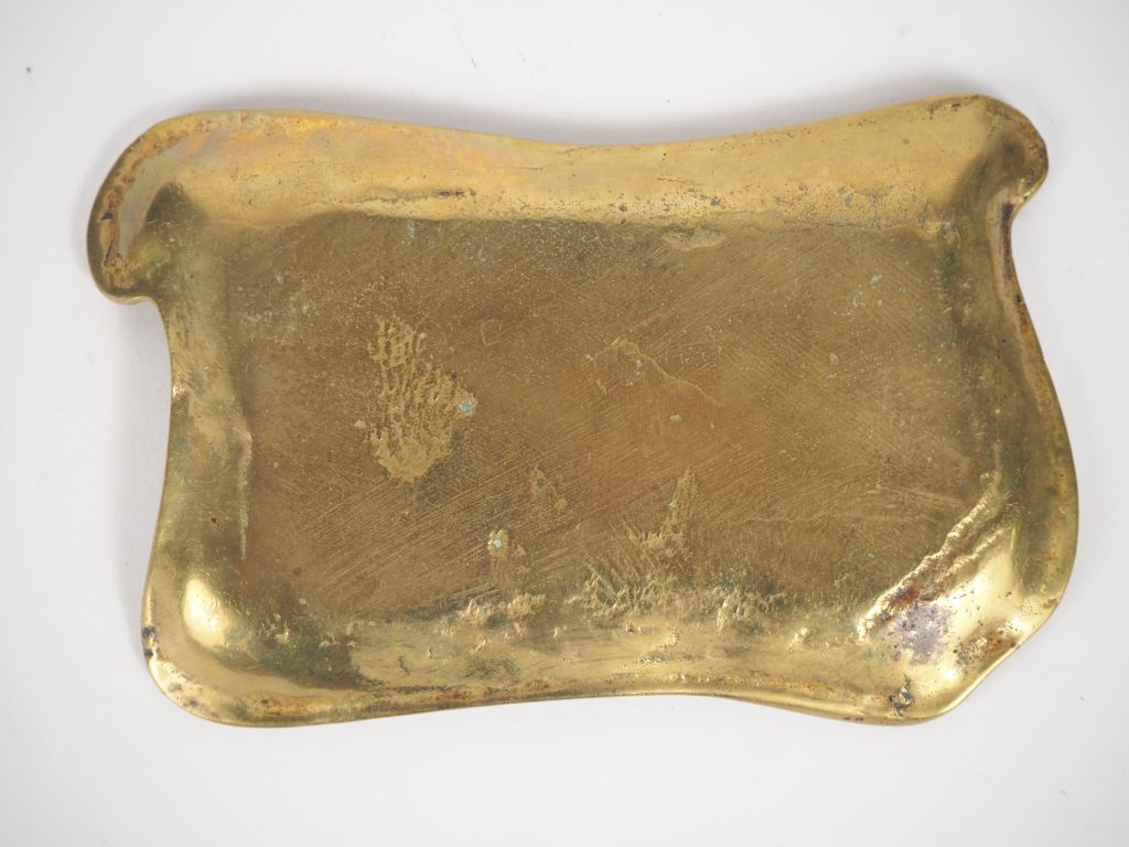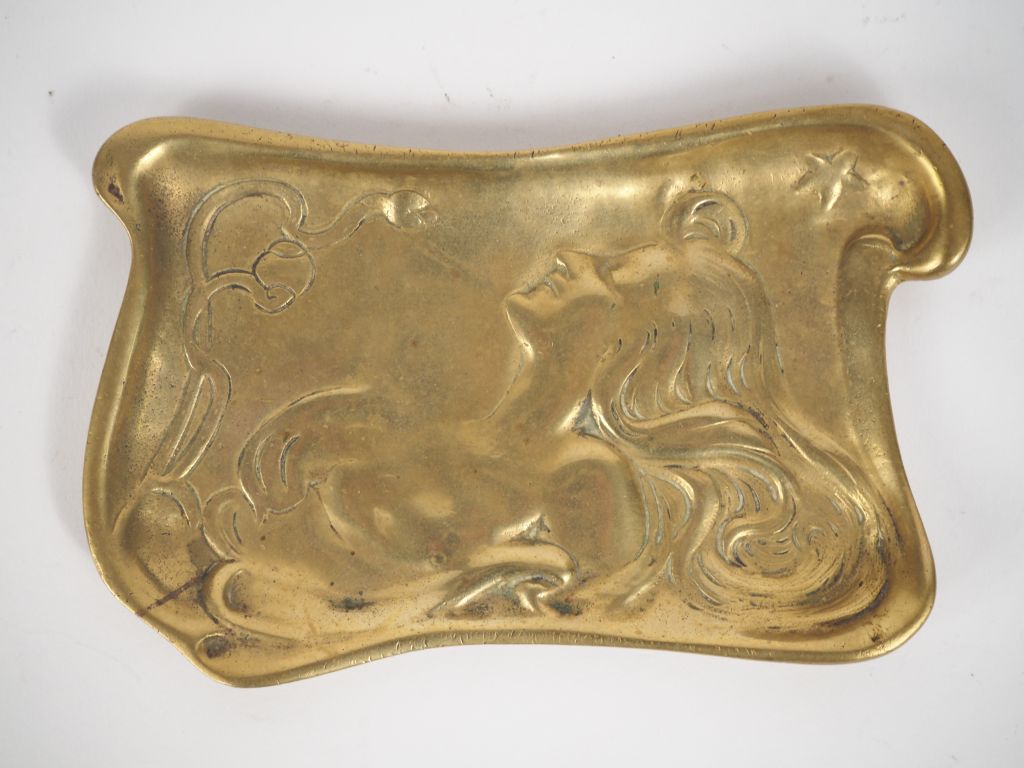 Cendrier de style Art Nouveau en bronze doré à décor d'un buste de jeune fille. Dim. 10 x 16 cm.