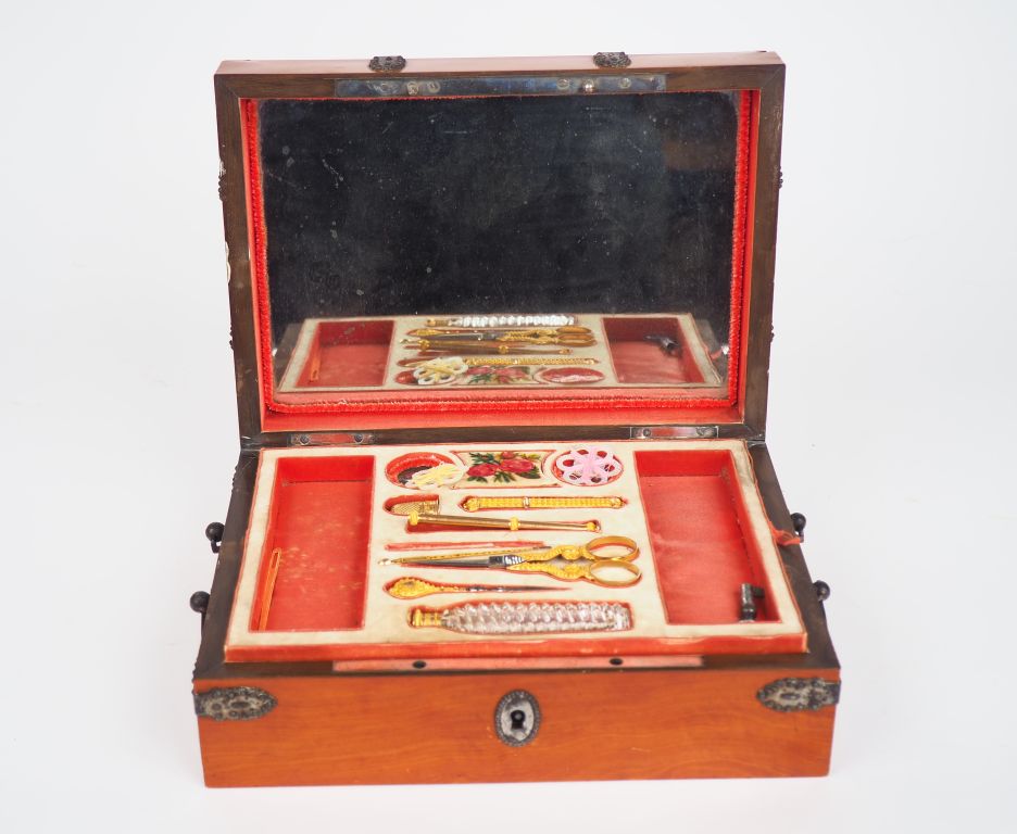 Coffret XIXème en bois et ferroneries interieur à fond de glace, contenant un nécessaire à couture en or, verre et nacre. Dim. 8,5 x 24,5 x 18 cm. (sauts de placage).
