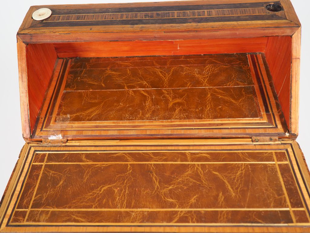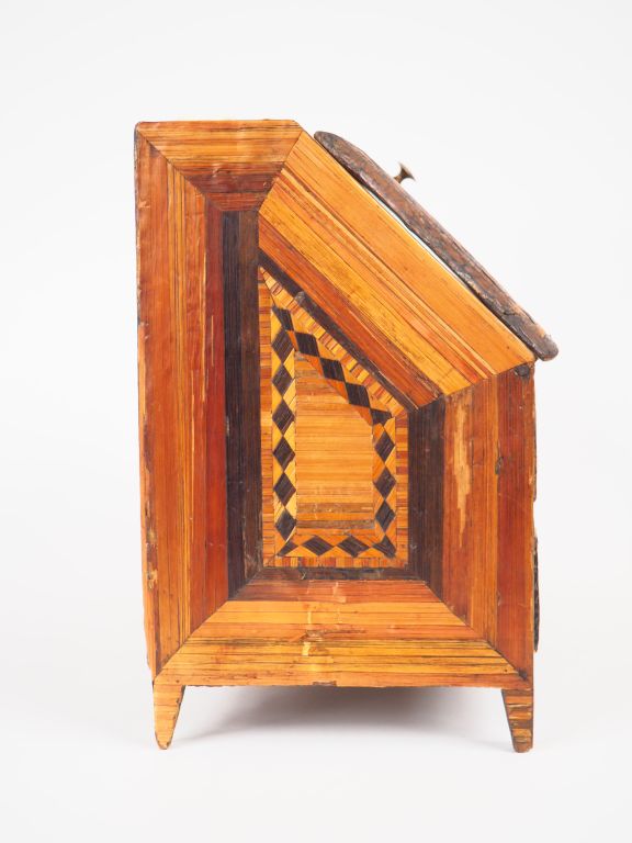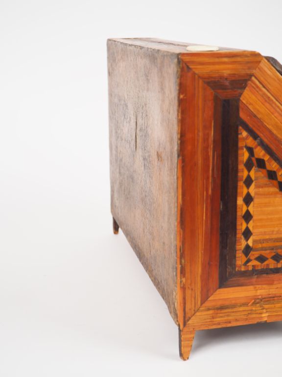 Commode de maîtrise début XIXème en marqueterie de paille en forme de commode scriban à décor de motifs géométriques. Dim. (26,5 x 36,5 x 16,5). (Petits accidents)