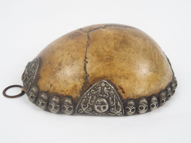 Coupe à boire de cérémonie ésotérique constituée à partir d'une calote cranienne gainée d'argent bas titre à décor de frises de tête de mort