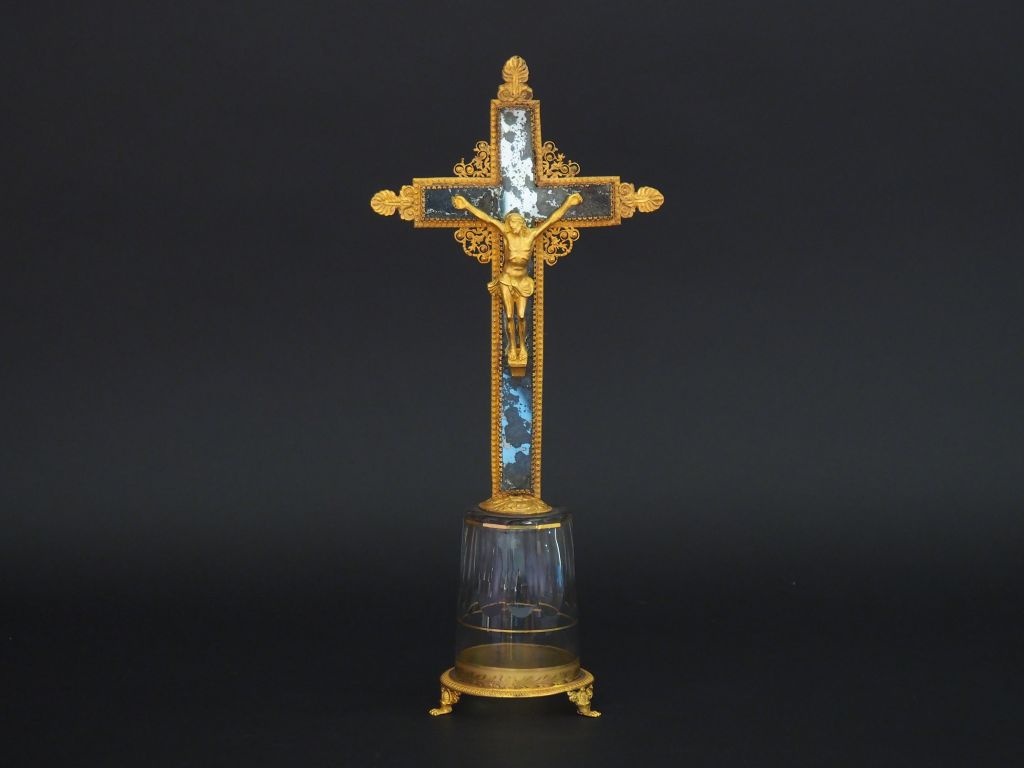 Crucifix XIXème en métal doré, verre et cristal, piétement tripode à g...
