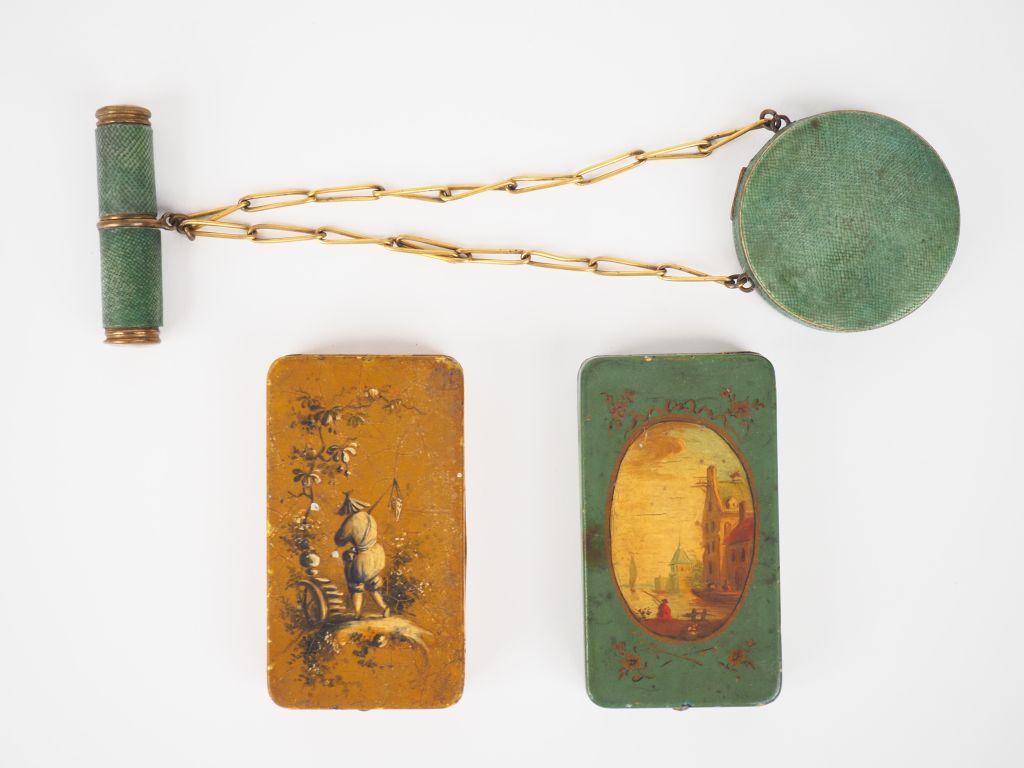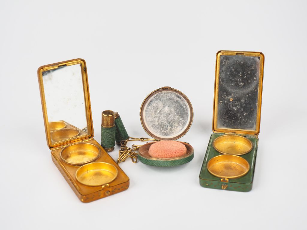 Deux boîtes à poudre fin XIXème en métal peint et doré, l'une à décor d'un paysage animé dans une réserve, l'autre à décor de chinoiserie. Dim. 8 x 4,5 cm. (Usures). On y joint un poudrier et un étui à rouge à lèvre en galuchat et métal doré.