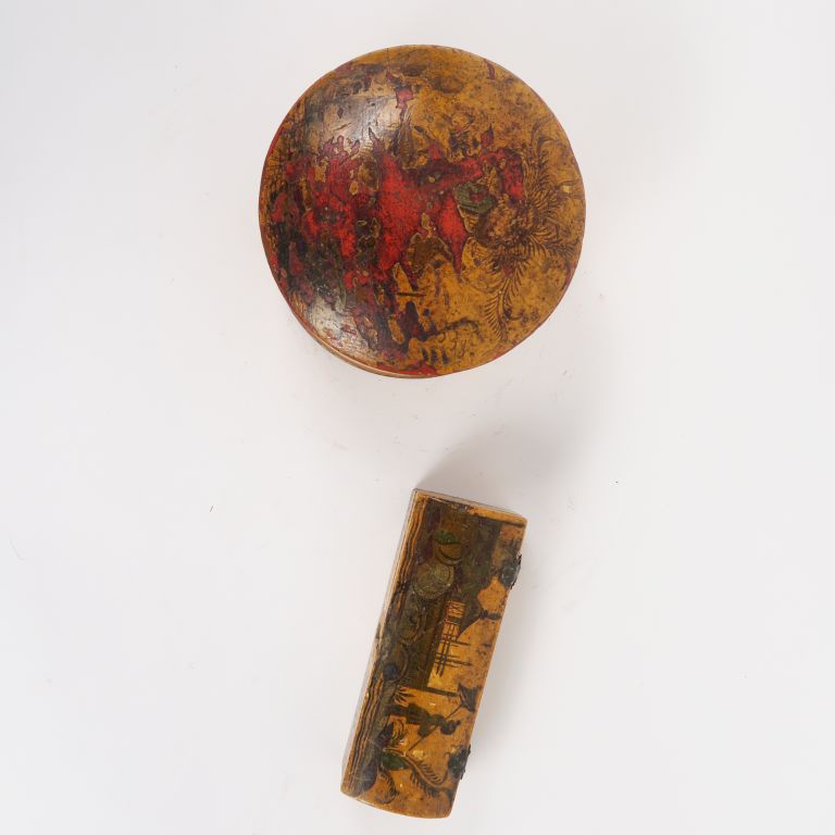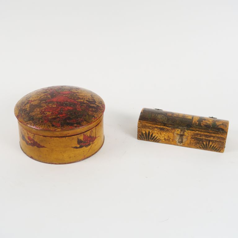 Deux boîtes en bois laqué polychrome, à décor de scènes extrême-orientales. Dim: 9 x 13,2. Dim: 3,5 x 13,5 x 4,8 cm.