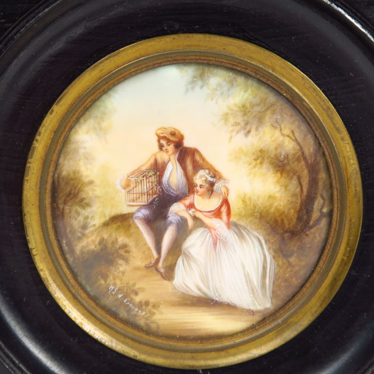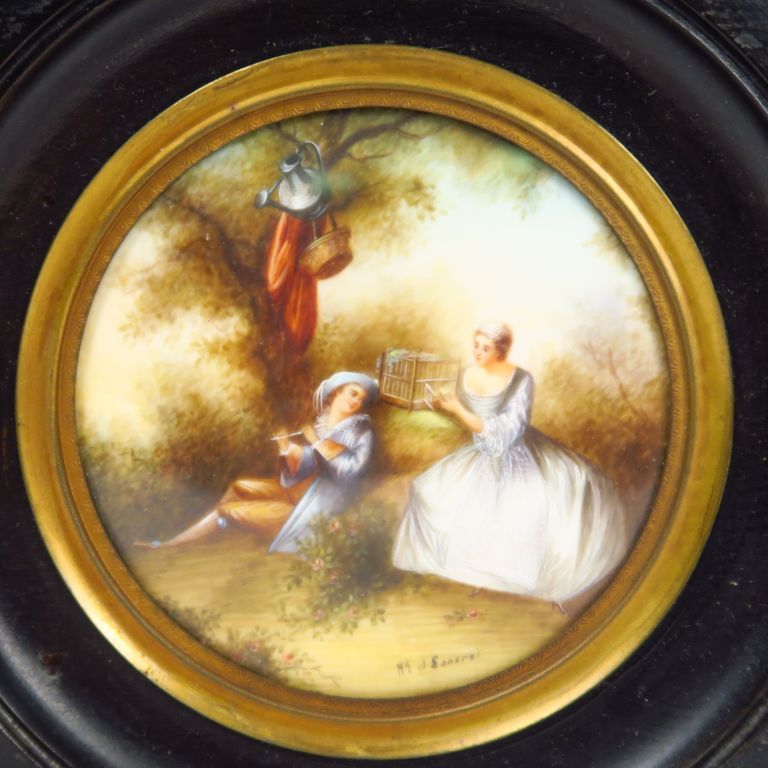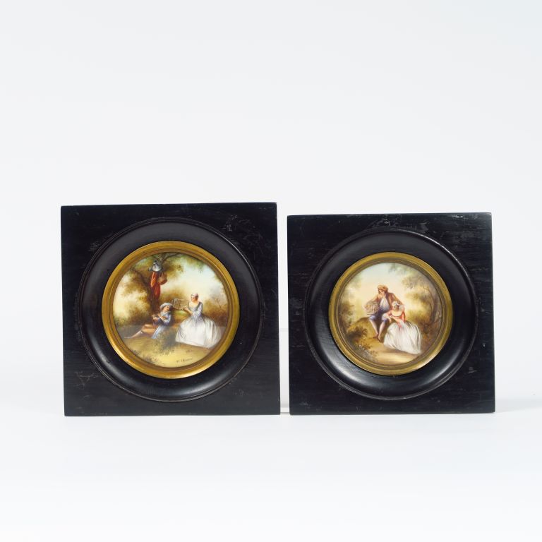 Deux miniatures sur ivoire dans le goût du XVIIIème "Scènes galantes" , signées. Diam. : 7,5 cm.
