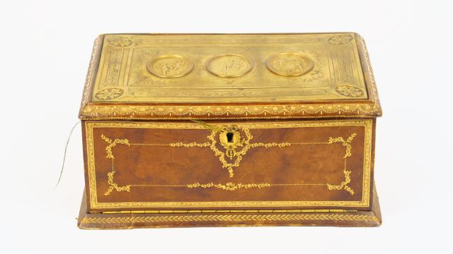 Ecrin à bijoux de style Louis XVI en cuir, couvercle en métal gravé à décor de médaillons figurant des enfants, signés Legastelois