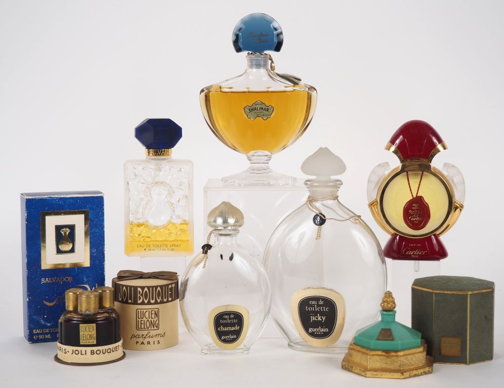 Ensemble de flacons de parfums : - Parfum Panthère de Cartier - Parfum Shalimar de Guerlain - Parfum le Début de Richart Hudnut avec coffret - Eau de toilette Chamade de Guerlain - Parfum Joli Bouquet de Lucien Lelong - Eau de Toilette Salvador Dali - Eau de Toilette Jicky de Guerlain