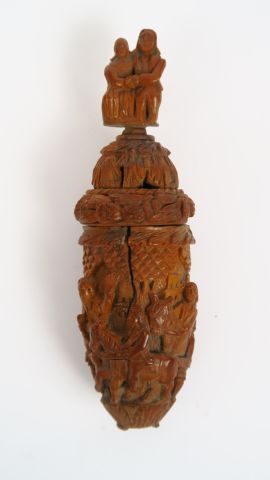 Etui à couture début XIXème en corozo sculpté, à décor de cavalier et de personnage (accidents)