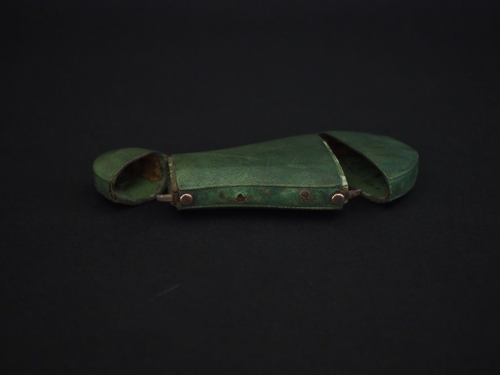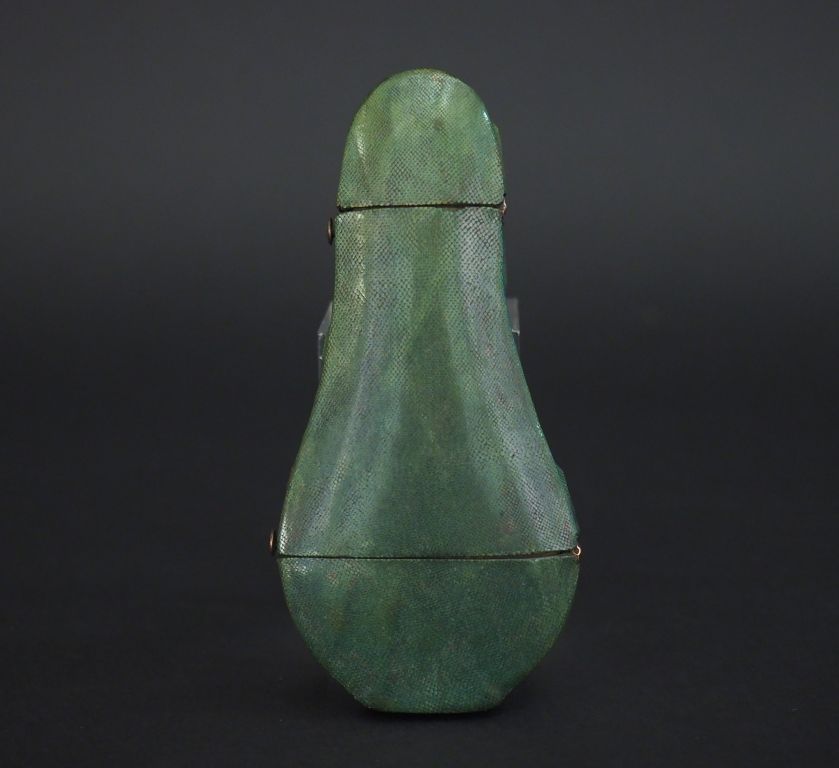 Etui de flacon à sels début XIXème en galuchat vert, boutons et charnières en argent, double ouverture. Dim. 12,5 x 6 cm. (usures).