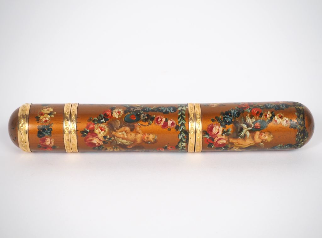 Etui Napoléon III de style Louis XVI en vernis martin et pomponne, à décor polychrome de putti dans des couronnes de fleurs. L. 15 cm.