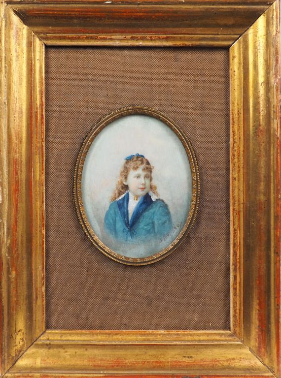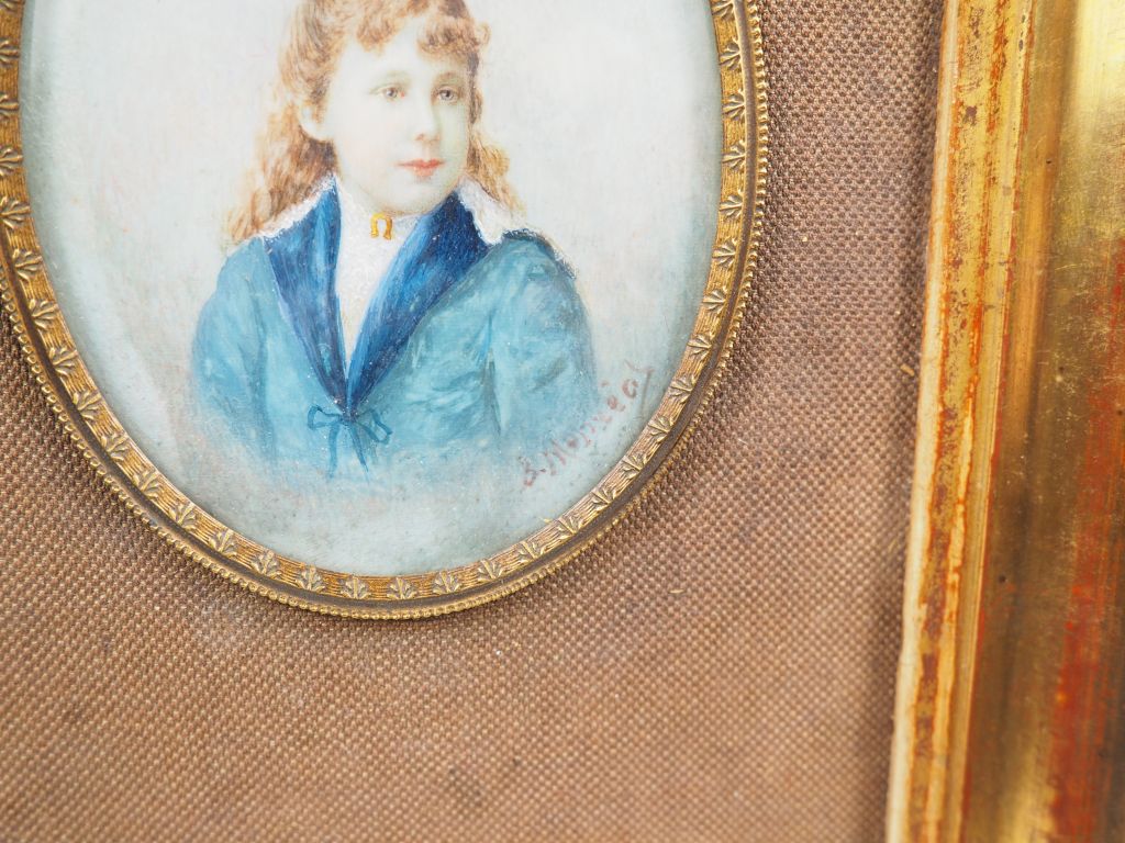 Fabienne LAMBERGER. monbréal Miniature 1900 "portrait de jeune fille à la robe bleue" Dim. À vue : 8,8 x 6,5 cm