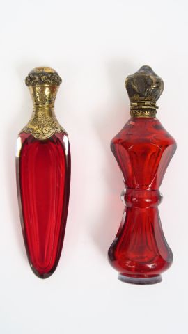 Flacon à odeurs de style Louis XVI en cristal à teinte rubis et argent , flacon à odeurs XIXème en cristal rubis et argent (cassé),