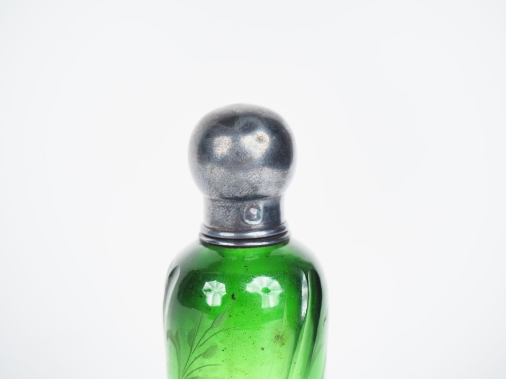 Flacon à odeurs en cristal bicolore et argent, poinçon Minerve, à décor gravé de fleurs. H. 14.5 cm