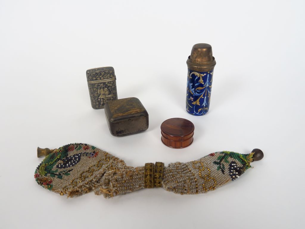 Flacon à odeurs en verre emaillé (sauts), une bourse en perles tressées (accidents), petit étui en argent à décor de fumeur de pipe, petite boite en buis et boite 1900 en métal à décor d'oiseaux