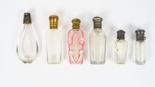 Flacon à odeurs XIXème en overlay bouchon en pomponne, 5 différents flacons à odeurs en cristal, bouchons en argent ou métal
