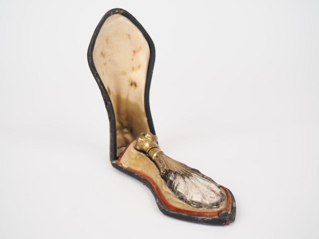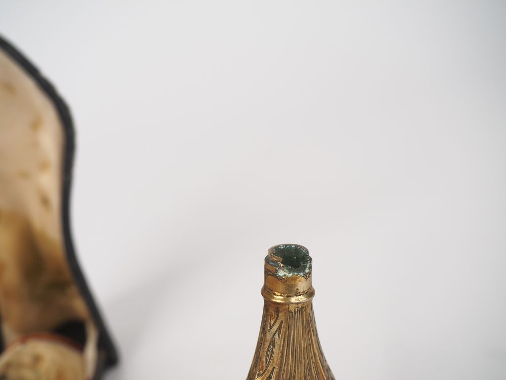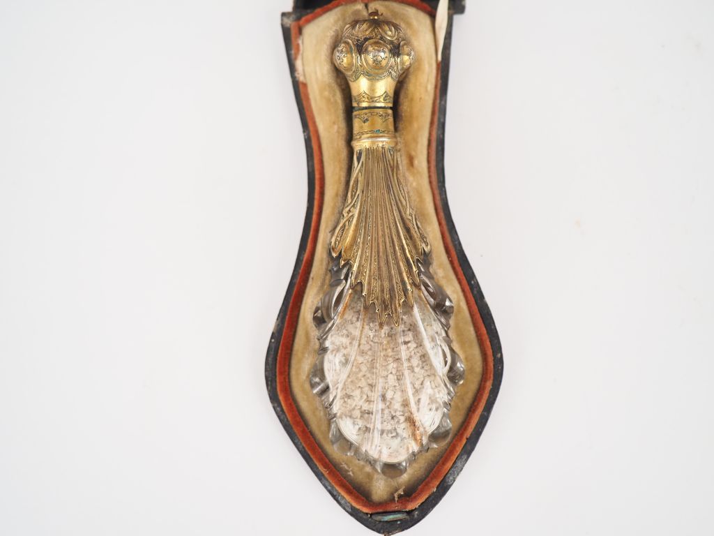 Flacon à sels début XIXème en métal doré et cristal dans son étui en cuir et velours. Dim. 4,5 x 15 x 6,5 cm. (Usures, charnière du flacon accidentée).