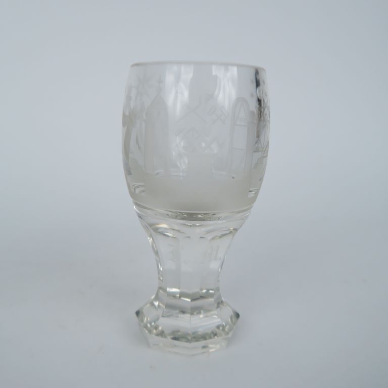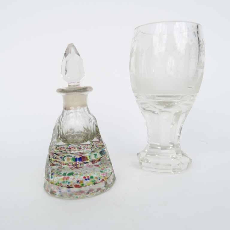 Flacon en cristal taillé et sulfure à décor moucheté. H. 14 cm. On y joint un verre maçonnique en cristal taillé et gravé. H. 15,5 cm.