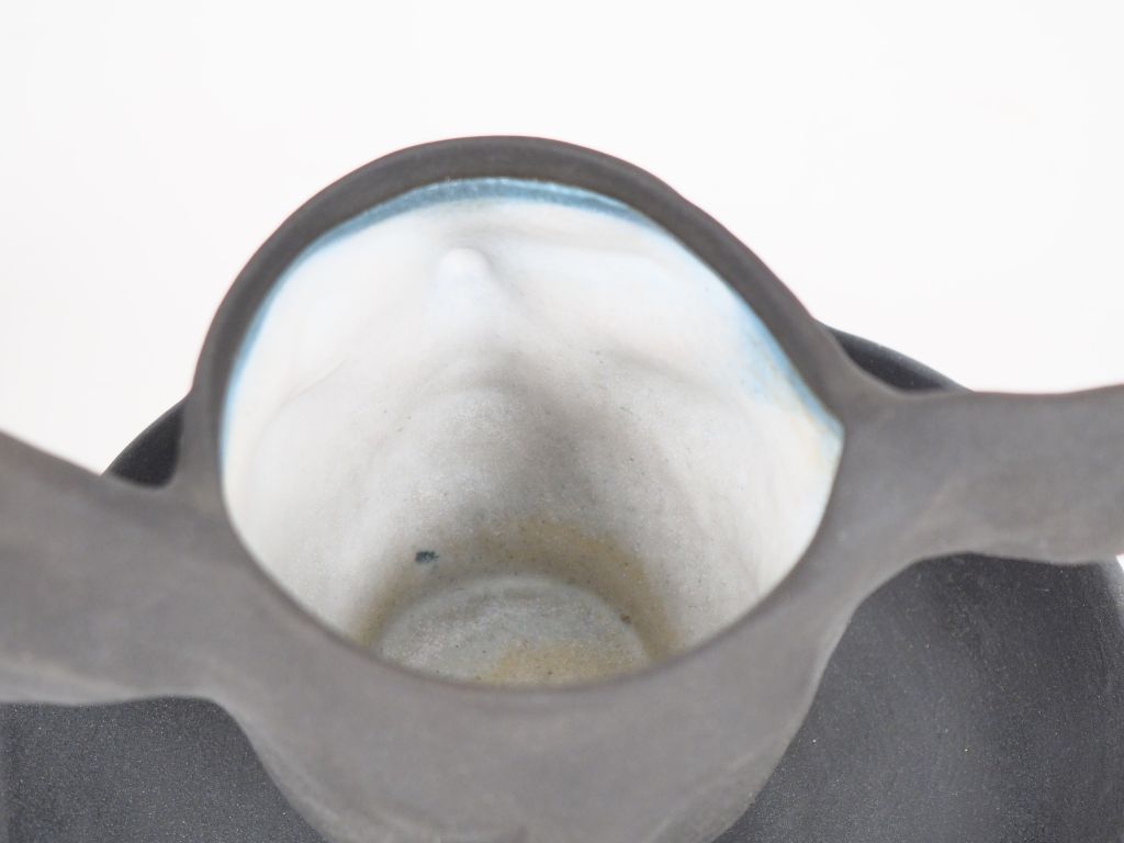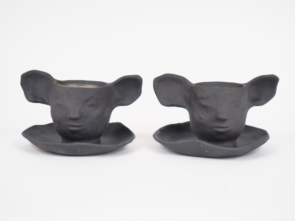 Françoise PETROVITCH. Deux tasses et sous tasses en céramique noire à décor de visages. Signées FP et datées 2006, numérotées140/150 et 143/150. H : 10 cm. L : 16 cm.