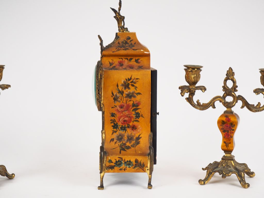 Garniture de cheminée de style Louis XV en Vernis Martin et métal doré comprenant une pendule, mouvement signé Fourgeaud. H. 37 cm et une paire de bougeoirs doubles (sauts de vernis).