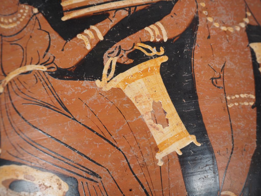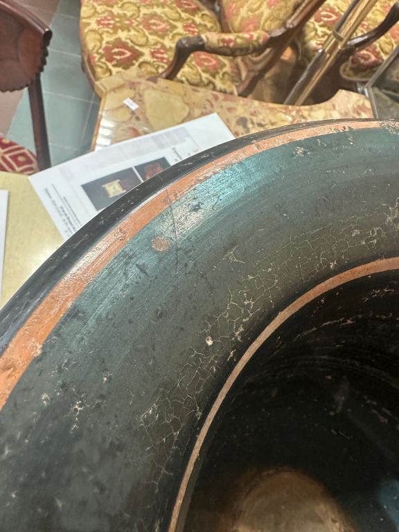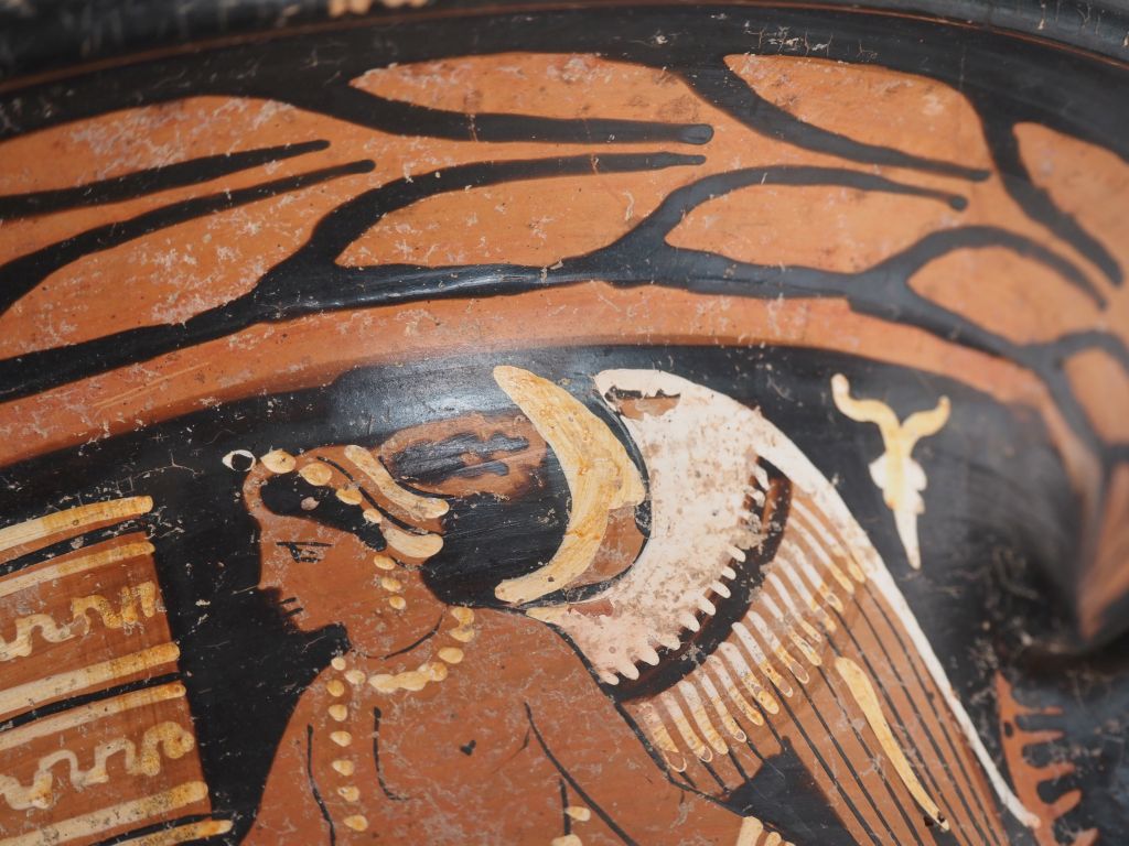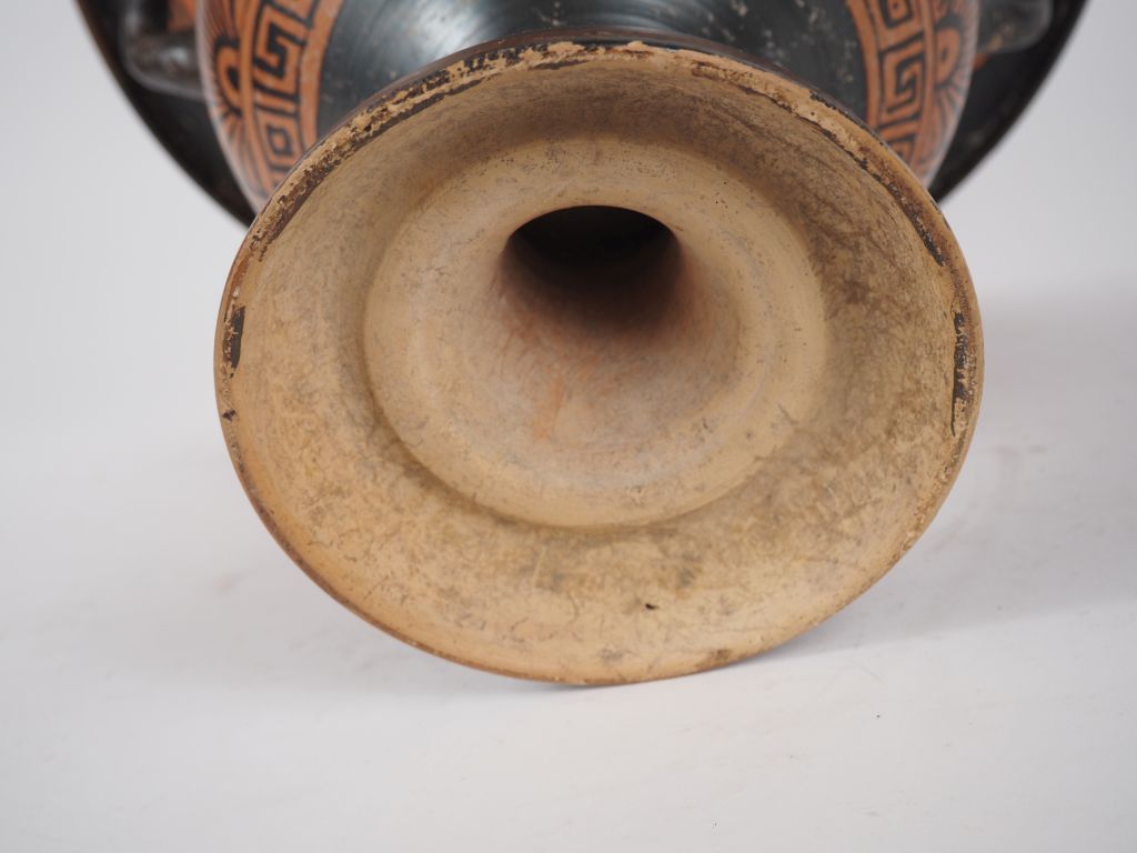 Grande Grèce, Apulie, IVe s. av. J.-C. Cratère en cloche à vernis noir et figures rouges figurant : Face A : Une femme assise tenant dans ses mains une torche et une corbeille. En face d’elle se tient Éros débout, tenant une ciste et une couronne (avec rehauts jaunes et blanc). Face B : Deux personnages drapés debout, de part et d’autre d’un autel ? l’un tenant une boite, l’autre un bâton. H. 31 cm, diam. 36 cm. (Restauration, usure superficielle de certains rehauts). Provenance : Hôtel Drouot, années 80. Expert : Jean-Sylvain Caillou, EI.