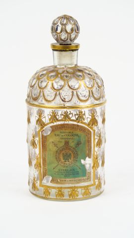 GUERLAIN. Flacon en verre moulé 'eau de cologne Impériale'. H. 22 cm (étiquette abimée)