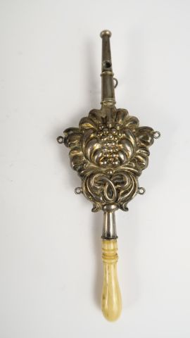 Hochet siffleur XIXe en argent repoussé à décor de grenade éclatée et de rinceaux. Manche en os tourné. Longueur : 15 cm. Poids tel : 19 g (manque les grelots)