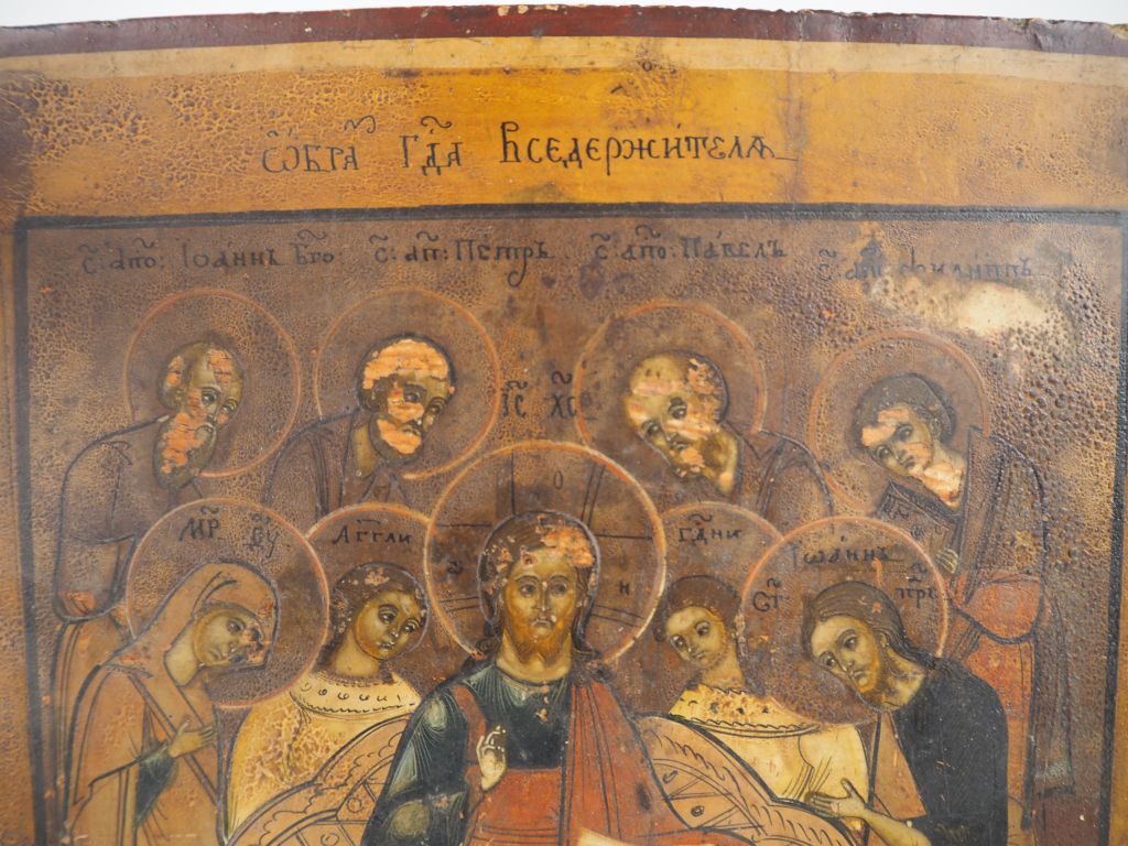 Icône du Christ en Majesté. Russie, fin du XIXe siècle. Autour de Lui, sur la rangée du haut les apôtres Saint Jean, Saint Paul, Saint Pierre et Saint Philippe, à Sa droite, la Vierge Marie et un ange et à Sa gauche, un autre ange et Saint Jean le Précurseur (Jean-Baptiste). Agenouillés à Ses pieds, Saint Zosime et saint Sabbatios de Solovki.. Tempera sur bois. Dim. 33 x 27 cm Expert : Nicolas Filatoff