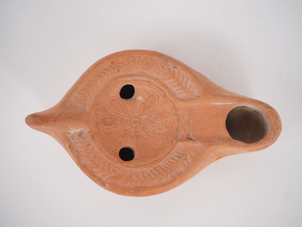 Lampe romaine au médaillon orné d’une rosette. III-IVe s. apr. J.-C. 13,5 cm Expert : Jean-Sylvain Caillou, EI.