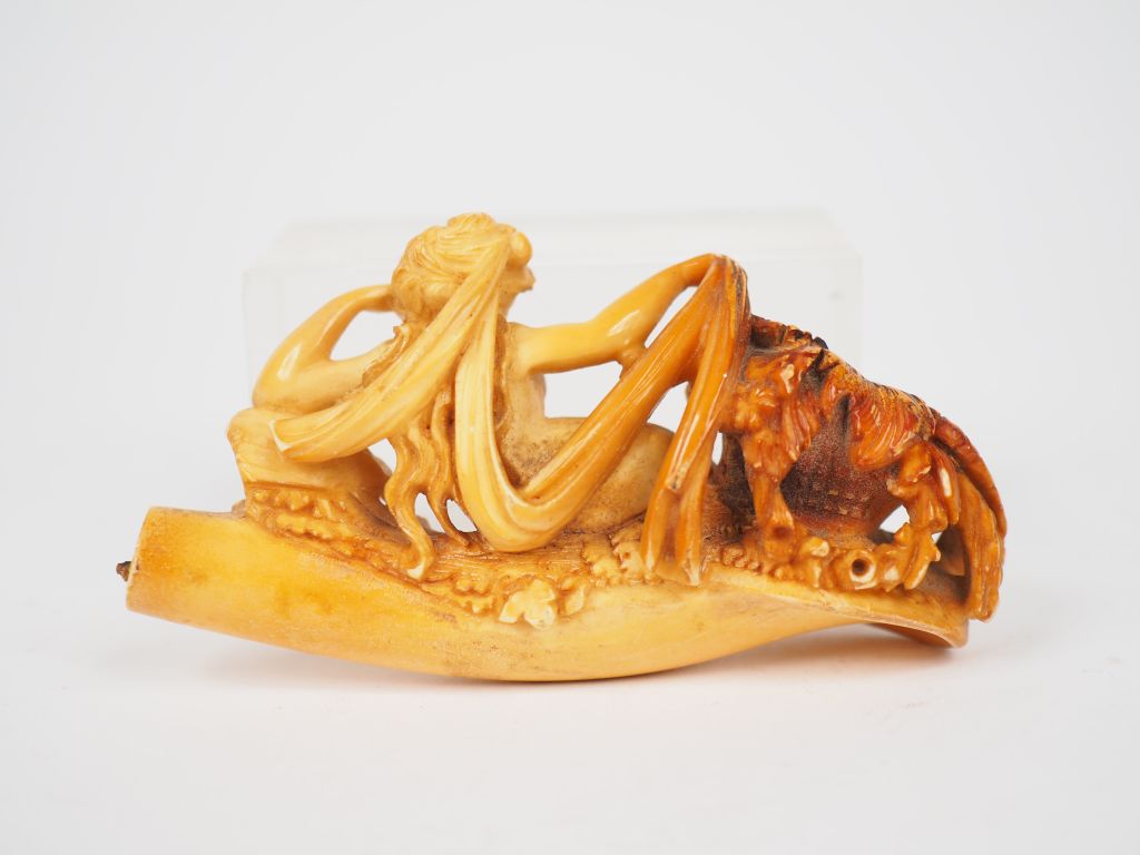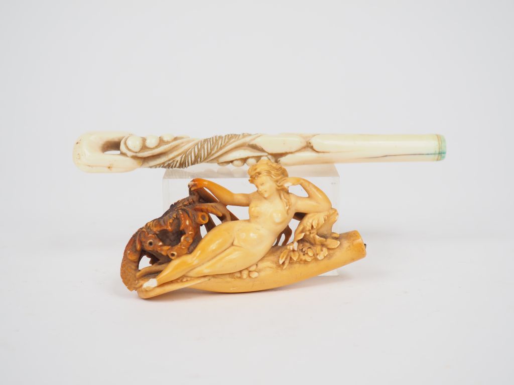 Manche d'ombrelle en ivoire sculpté (L. : 15 cm) et pipe en écume de mer sculpté à décor de jeune fille à la corbeille (petit accident).