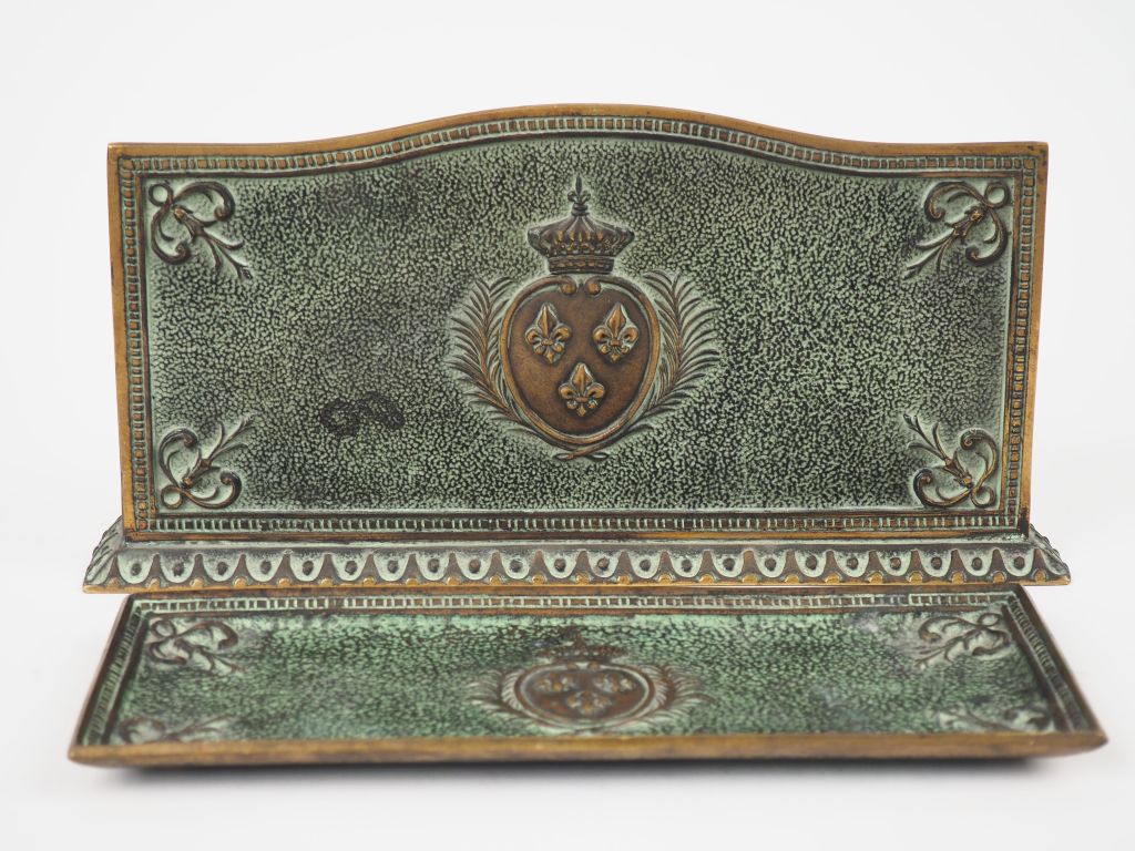 Max LE VERRIER. Nécessaire de bureau en bronze à patine verte, à décor de fleur de lys : comprenant un porte courrier et un plateau à stylos. Signé.